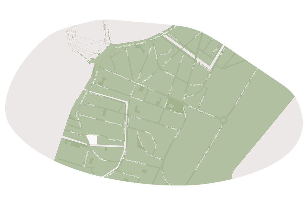 Une fois arrivés au Lido, tournez à droite et suivez la route qui longe la lagune pendant environ un kilomètre, en passant un rond-point, jusqu’à atteindre le centre de l’île. Au second rond-point prendre la deuxième sortie et continuer pendant environ 200 mètres sur Gran Viale S.M. Elisabetta, 28.